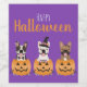 Ilustração de três cachorros franceses do Bulldog de diferentes cores em abóboras vestidas em trajes de Dia das Bruxas.