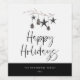Natureza moderna e simplista, rótulo da garrafa Feliz Feriados. Ramificação de aquarela adornada com pinecones e ornamentos decorativos de estrelas e design de tipografia quic.