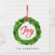Etiquetas de vinho de feriado, russas, com uma coroa de água verde pendurada por uma fita vermelha com "Joy" em um roteiro vermelho contra um fundo branco de proteção. Personalize as etiquetas de férias festivas adicionando seu nome ou outro texto personalizado.