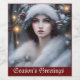 O rótulo da garrafa de vinho Feriado Personalizado apresenta uma bela princesa em chapéu branco aparado de pelo e embrulha com folhagem de inverno num retrato de estilo vintage. Um belo retrato temático de Natal criado com software gerador de IA. Personalize o texto da mensagem "Saudações da Estação" ou deixe como está