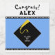Graduação criativa de etiquetas de presentes e decoração de festas com boné de formatura preto clássico e design de tassel dourado sobre fundo azul-claro. Para personalizar o texto de edição para adicionar nome e ano de classe de mais velho.
