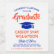 Adicione um toque personalizado às decorações de festas de formatura ou colégios com estas elegantes etiquetas de garrafas de vinho laranja e azul. Design apresenta um fundo branco, boné conselho de argamassa azul, tipografia na moda moderna, caligrafia de script de estilo manuscrito e uma mensagem personalizável lendo "Parabéns para nosso Formando". O texto na parte inferior inclui ano de aula, nome de escola e linhas opcionais para grau, tipo de bebida ou outras informações. Todo texto é simples de personalizar. Essas etiquetas fazem uma ideia de na moda festa de formatura e uma elegante adição à celebração do dia especial do formando. Felicidades!