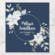Rótulos de vinho personalizáveis elegantes e românticos para o seu casamento, apresentando um lindo buquê de flores brancas suaves em aquarela, sobre um clássico fundo azul prussiano escuro. Edite facilmente os campos do modelo para adicionar os nomes dos noivos em uma fonte branca elegante, e a data do casamento em uma fonte moderna em letras maiúsculas.