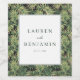 Este rótulo de vinho de casamento apresenta um design moderno e botânico com um fundo exuberante de folhas tropicais estilizadas em vários tons de verde. O retângulo branco central fornece um contraste limpo, enquadrando um texto personalizável e elegante em uma fonte serifada clássica. Perfeito para celebrar o seu dia especial, o design combina motivos orgânicos com tipografia refinada para criar uma atmosfera de sofisticação e alegria. Ideal para adicionar um toque pessoal às suas festividades de casamento, este rótulo é elegante e versátil.