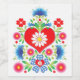 Imagens estilizadas, de Mod e Folksy em um rótulo de vinho. Celebrar feriados ou comemorações diárias. Cravos folclóricos são unidos por margaridas, folhagem e corações para um bonito olhar folclórico sobre um fundo branco de neve.