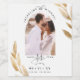 Anuncie sua data de casamento em estilo. Seus hóspedes vão adorar o anúncio e apreciar o presente legal! Quer você adicione rótulo a uma garrafa de vinho ou qualquer outro frasco, garrafa, caixa ou qualquer outra coisa que você quiser, depende de você, a garrafa de vinho é simplesmente um exemplo. Design com uma camada elegante de fotos em arco enquadrado com seus nomes. Folhas de ouro atrativas nos lados e detalhes modernos de caligrafia escrita à mão. Design com folhas em várias opções de cores.
