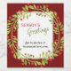 Rótulo de garrafa de vinho de Natal corporativo exclusivo, clássico, moderno, bonito e decorativo. Texto de Boas Festas alegre e espaço para personalizar ou personalizar com uma mensagem de sua escolha no verso do cartão. Enmarcado por bagas de vinho Borgonha vermelhas e uma coroa de folhagem verde escura em um fundo verde floresta sofisticado.