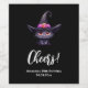 Etiquetas de aniversário com uma ilustração temática divertida do Dia das Bruxas para amantes de gatos. Um gato preto de olhos grandes vestindo um chapéu de bruxa preta grande com um cinturão roxo rosa ao redor da borda.