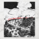 Uma ilustração negra e branca de uma famosa ponte ferroviária na Escócia. Glenfinnan Viaduct, com uma locomotiva vermelha / trem a vapor sobre ela.
