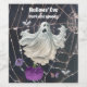 Humor de Halloween com fantasma, morcegos, abóbora e flor roxas, borboleta roxa com teia aranha minúscula. Texto personalizável. Escolher