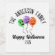 Adicione um toque festivo às suas comemorações de Halloween. A design apresenta uma decoração fofa do Dia das Bruxas com rostos de abóbora laranja, verde e roxo. Isto é perfeito para abençoar seus amigos para festas de Halloween e sacos de presentes! O destaque? Um recurso personalizado de nome da família! Adicione seu nome de família ao design, como "A Família Smith", criando um recurso único e pensativo de feriado que é realmente seu.