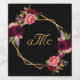 Um fundo preto chic com uma falsa estrutura geométrica dourada. Decorados com flores roxas escuras e burgueiras, rosas e penas do estilo "boho". Personalize e adicione seu monograma, iniciais. Seu nome familiar é inicial no meio com letra maiúscula. Letras coloridas com ouro.