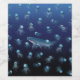 Uma ilustração de uma baleia e água-viva nadando nas profundezas do oceano. Um padrão de águas-vivas azul e marinho.