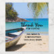 Etiquetas de engarrafamento com uma cena de praia tropical idílica. Água clara de cristal azul turquesa e uma praia arenosa castanha macia. Algumas folhas de palma penduradas de cima. Um velho barco a remo de madeira fica sentado na praia. Uma paisagem serena e pacífica.