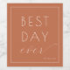 These elegant wine labels feature a warm, earthy color palette with a soft terracotta background and sophisticated white typography. The design exudes a timeless charm with its clean lines and minimalist aesthetic, making it perfect for celebrating special occasions like weddings or anniversaries. The phrase "Best Day Ever" adds a touch of joy and sentimentality, while the simple yet stylish layout ensures these labels will complement any bottle beautifully. Ideal for marking memorable moments, they offer a subtle way to personalize your celebration.