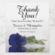 Estas lindas etiquetas de garrafa de vinho são a adição perfeita à sua celebração de casamento. O design apresenta um rosa de cor azul, marinho, longo e profundo, que se apresenta numa piscina de água com ondulações e ondas. A legenda diz: Obrigado por comemorar conosco. Há espaço para os nomes dos casais de casamento, a data do casamento e o tipo de vinho ou outro conteúdo da garrafa.