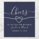 Moderno, minimalista, elegante, simples roteiro de caligrafia manuscrito marinho rótulo azul de vinho de casamento com coração de corda prateada. Saúde ao Amor e Felicidade.