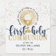 Moderno, elegante obrigado da Primeira Comunhão, você usa rótulos de garrafas. Design apresenta ícone de cálice de ouro, script de tipografia ''Primeira Comunhão'', confete de ouro. Personalize com uma mensagem de nome, data e obrigado.