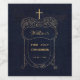 Este elegante desenho de primeira comunhão com um ar vintage, recomendado para um menino, tem uma moldura decorativa com uma parte superior ornamentada que tem uma forma que lembra asas de anjo, com decorações em espiral representando folhas estilizadas no interior e com uma cruz dourada no topo, e mais simples na parte inferior, terminando em pequenas espirais e dois pequenos ramos com folhas sob o texto. O fundo é azul-marinho. O nome do menino é escrito em uma fonte caligráfica elegante. Todo o texto pode ser personalizado e tem uma cor dourada semelhante à cruz de ouro.