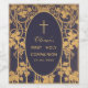 Este rótulo de vinho azul e elegante com um ar vintage, apropriado para a primeira comunhão de um menino, tem uma moldura dourada antiga com decorações douradas representando videiras e uvas em um fundo azul-marinho. O texto está em um oval no centro. Acima do oval há uma coroa dourada. Na parte superior do oval, acima do texto, há uma cruz dourada. O nome da criança é escrito em uma fonte caligráfica elegante, o restante em letras maiúsculas. Todo o texto pode ser personalizado e tem uma cor dourada semelhante às decorações douradas da moldura.