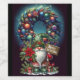 Um gnomo festivo está rodeado por elementos vibrantes do Natal, incluindo uma coroa exuberante adornada com ornamentos coloridos e flores. Segurando um sinal de "Feliz Natal", a cena irradia alegria e cores vivas. Digital Art Photoshop CS5