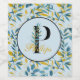 Belo design apresenta fundo de folhas azuis e douradas sobre fundo azul claro com monograma/ P inicial com folhas embelezadas no círculo central. Personalizar com o nome na fonte do script de cor dourada amarelo