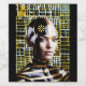 Uma mulher com cabeça careca e pintura corporal futurista listrada de preto e ouro se posiciona diante de um fundo geométrico. Ela tem uma design de flor amarela decorativa na testa.