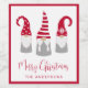 Mínimos rótulos de vinho com três gnomos de Natal nórdicos bonitos, com chapéus e tunicados de cinzas nórdicas, de cor vermelha e branca, sazonais, escandinavas. "Feliz Natal" está em um roteiro na moda vermelho. Adicione o seu nome à tipografia vermelha moderna.
