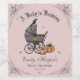 Um elegante cor-de-rosa pincelado "Um Bebê está a Comprar" Queda design de chá de fraldas a tinta preta desenhada à mão por Nathalie Portet. Apresenta uma antiga carruagem vitoriana, corvo preto, abóboras e teias de aranha sobre um elegante fundo cor-de-rosa pincelado. Nome, Evento e Data do Evento são editáveis.