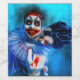 Palhaço ameaçador de SlipperyJoe Feliz Halloween vermelho faca mau grin vermelho nariz ruivo mal humor assustador orgulho gay artístico mau presentes LGBTQIA palhaço branco azul roupa branca lisa branco colarinho rufflado dentes sinistro grin azul fundo bolhas brancas