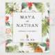 Rótulos de vinho personalizados são perfeitos para adicionar um toque único e personalizado ao seu vinho de mesa, lembranças de casamento ou presentes de boas-vindas. Design elegante e sofisticado para casamentos de primavera ou verão apresenta padrão tropical em aquarela de flor vermelha, folha de palmeira e abacaxi. seus nomes, data do casamento e variedade de vinho ou mensagem personalizada em letras elegantes. Projetado para combinar com nossa suíte Padrão Tropical.