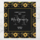 A garrafa de vinho rotula com um padrão elegante e na moda. Bonito girassóis amarelos e folhas verdes cercadas por delicadas cadeias de ouro. Fundo preto. Um quadrado com uma borda falsa dourada colocada sobre cima com um dentro de texto personalizado.