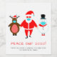Uma marca engraçada para o Natal e Anos novos de presentes de vinho para celebrar o final para um ano difícil de 2020. Um boneco de neve e renas, liderado por um legal retrô Papai Noel, estão vestindo máscaras de rosto sobre "Peace Out 2020!" em divertida timento tipografia vermelha. Você pode personalizar a mensagem "Peace Out", o cartões de natal (inicialmente definido como "Feliz Feriados e Animações para um Ano Novo") e seu nome.