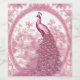 Ilustração vindimada de pavão rosa e etiqueta decorativa de vinho de fundo.