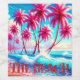 Este rótulo de vinho diz "A Praia" nele com uma cena de palmeira e o oceano pintado nela.