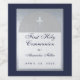 Um design religioso simples mas moderno. Sobre um fundo retangular azul-marinho, tem um arco de folha falsa de prata que contém texto azul-marinho sobre fundo branco. Há uma folha falsa de prata acima do texto. A ocasião e o nome são escritos em uma elegante caligrafia.