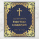 Este elegante desenho religioso em azul-marinho e dourado com um ar vintage, recomendado para um menino, tem uma moldura ornamentada em folha de ouro falsa com elegantes decorações barrocas sobre um fundo azul-marinho. Acima do texto há uma cruz religiosa em folha de ouro falsa. A ocasião também está em folha de ouro falsa; o restante do texto tem uma cor dourada semelhante à moldura de ouro falsa.