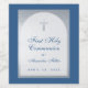 Uma design religiosa simples, mas moderna. Em um fundo retangular azul clássico, ele tem um arco de folha de alumínio azul falso que tem dentro azul sobre fundo branco. Há uma folha de prata falsa acima do texto. A ocasião e o nome são escritos em um roteiro caligráfico elegante.