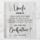 Peça ao seu irmão, primo, ou melhor amigo para ser o padrinho do seu filho com estas etiquetas de garrafa de vinho. Rótulos únicos de vinhos modernos apresentam um roteiro de caligrafia, sua mensagem em um fundo de textura de madeira.