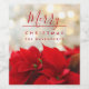 Etiquetas de garrafa de vinho personalizadas com uma fotografia festiva de férias, com um buquê de poinsetos vermelhos no fundo. Luzes de anzol do ouro em segundo plano. Uma tipografia feliz de Natal escrita em uma fonte vermelha de tendência.