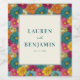 This is a floral style image featuring a beautiful and colorful array of flowers in shades of pink, orange, yellow, blue, and green. The central white panel elegantly displays the names "Lauren and Benjamin" along with their special date, May 23, 2026. The composition exudes warmth and joy, making it perfect for celebrating love and new beginnings. It's an inviting design that captures the essence of springtime romance and would be ideal for wedding invitations or announcements.