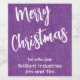 Roteiro moderno de pincel branco, Feliz Natal, em um fundo de impressão de jeans roxo, saudação e nome comercial ou pessoal. Rótulo perfeito para garrafa para as festas, para colegas, clientes, amigos. Você receberá seis rótulos impressos de 3,5" x 4" por pedido a este preço fantástico e impressão excelente. Altere facilmente o texto usando o modelo fornecido. Veja "Sobre Este Produto" ao lado para mais informações.