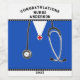 Criativo que ensina o adesivo da graduação da escola de enfermagem ou a decoração do rótulo da garrafa de formando com esfregões médicos azuis. Editar texto para adicionar o nome do formando de enfermagem.