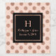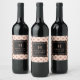 Etiqueta de vinho de casamento do tamanho do cheio elegante feita em ouro rosa em fundo de bolinhas. Uma área de texto quadrado em ouro preto e rosa, no meio do rótulo, tem um monograma de letras solteiros e texto personalizado pronto para personalizar para ler o que você quer.