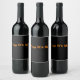 Etiqueta de vinho preto com texto cor de laranja.