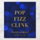 Etiqueta elegante com as palavras "Pop Fizz Clink" em folha de ouro falso sobre um fundo de luzes bokeh azul safira. Perfeita para festas de noivado, casamentos, aniversários ou outros eventos.