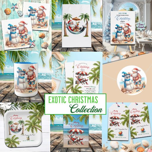 A funny Christmas design with Santa and Snowman on a tropical island! You can personalize this with your own details.