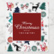 Esta etiqueta de vinho de Natal mostra Papai Noel, Reindeer, Pinheiros, Mittens, e flocos de neve em um fundo branco. A tipografia "Feliz Natal" está em branco. Você pode personalizar a saudação e o nome.