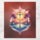 Solar anchor in a tropical paradise. Vibrant design with prominent anchor and cross, surrounded by palm trees, radiant sun and island scenery; neon palette and intense sunset for a bold and tropical look.