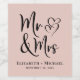 Uma etiqueta de vinho chic para sua recepção de casamento, hora do coquetel, festas ou para comemorar seu dia especial. Estas etiquetas cor-de-rosa com pincel personalizado contêm "Sr. & Sra." escritas num grande script e uma ilustração de dois corações unidos. Adicione seus primeiros nomes e a data do casamento.